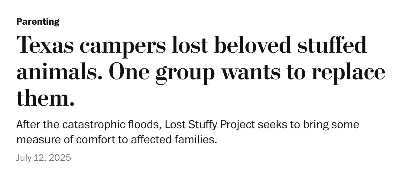 For the first time, the group has also received several heartbreaking requests on behalf of grieving parents. A friend of one bereaved family shared that a 9-year-old girl had brought a treasured stuffed Jellycat-brand monkey with her to Camp Mystic, and her parents wanted it back — or one just like it — to place atop her casket at her funeral.
